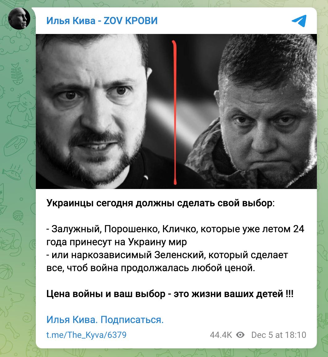 Последняя запись в телеграм-канале Кивы датирована сегодняшним днем. Она появилась в 8:48 по киевскому времени (9:48 по московскому). В этом посте он призывал Владимира Зеленского к самоубийству.