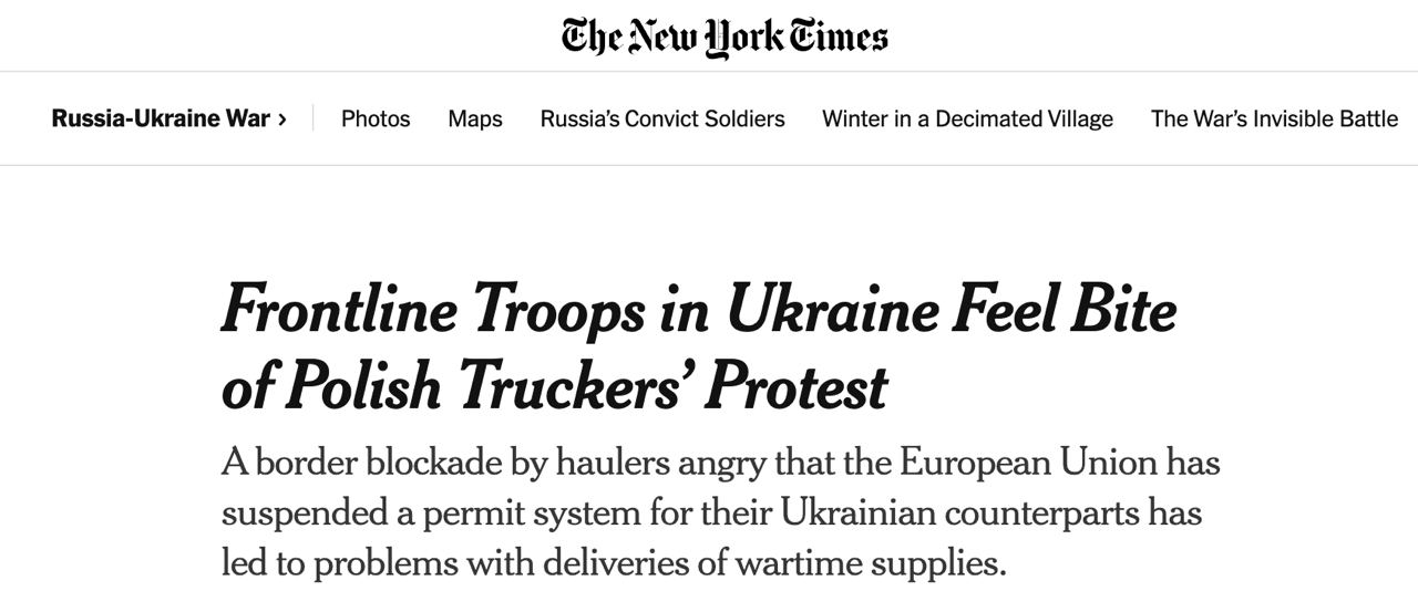 Польская блокада границы привела к проблемам с поставками военных грузов на передовую.