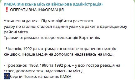08.00 Во время отражения ракетного удара по Киеву произошло падение обломков ракет в Дарницком районе города. Травмы получили четверо жителей Бортничей.