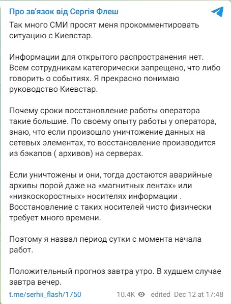 "Информации для открытого распространения нет. Всем сотрудникам категорически запрещено что-либо говорить о событиях. Я прекрасно понимаю руководство "Киевстар". Почему сроки восстановление работы оператора такие большие. По своему опыту работы у оператора знаю, что если произошло уничтожение данных на сетевых элементах, то восстановление производится из бэкапов (архивов) на серверах. Если уничтожены и они, тогда достаются аварийные архивы, порой даже на "магнитных лентах" или "низкоскоростных" носителях информации. Восстановление с таких носителей чисто физически требует много времени. Поэтому я назвал период сутки с момента начала работ. Положительный прогноз завтра утро. В худшем случае завтра вечер", - написал специалист в своем телеграм-канале.