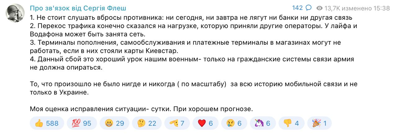 Он добавил, что произошедший сбой по масштабам огромен: такого не было нигде и никогда за всю историю мобильной связи, и не только в Украине.