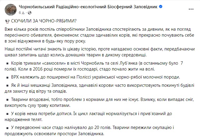 КРС из зоны отчуждения. Фото: facebook.com/zapovidnyk2018