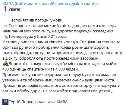 В четверг, 14 декабря, в Киеве неблагоприятные погодные условия - мокрый снег и дождь, местами гололедица, налипание мокрого снега. Температура от 0 до 2 тепла.