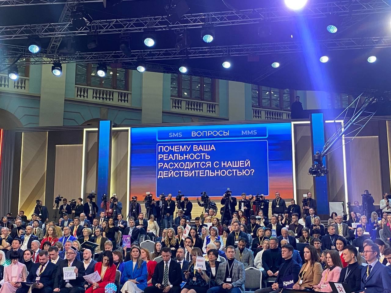 2/3 времени он говорил на внутрироссийские темы, преимущественно социально-экономического характера (цены на яйца и коммуналку, пенсии, ремонты, производство самолётов для гражданской авиации, открытие новых объектов в регионах и прочее). Причем на экране, который висел в зале, мелькали явно "неудобные" для Кремля вопросы.