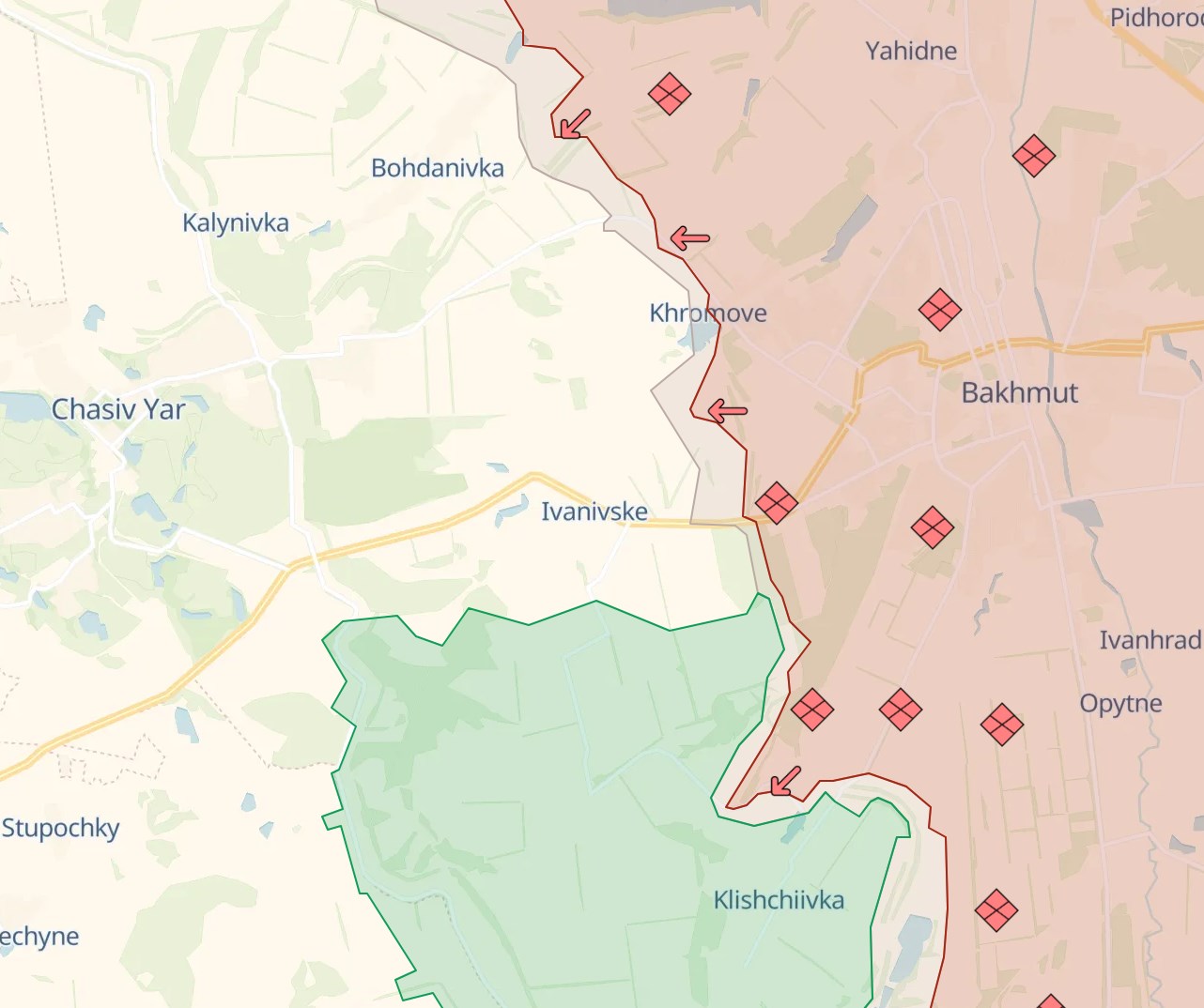 Под Бахмутом армия РФ наступает по трассе на Часов Яр, сейчас бои продолжаются у восточных и северных окраин Богдановки. К югу от Бахмута "трудная ситуация" у ключевой высоты возле села Клещеевка. По данным украинского паблика, бои там продолжаются, российские же телеграм-каналы утверждают, что высота захвачена, что позволило российской армии взять под огневой контроль Клещеевку и все дороги в окрестностях.