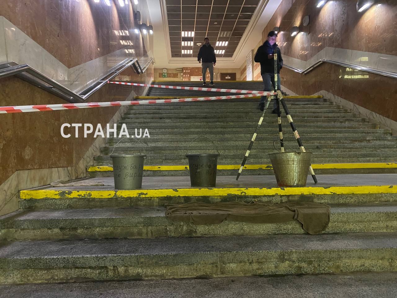 На станции киевского метро "Вырлица" протекает потолок на спуске к посадочной платформе. Фото, видео