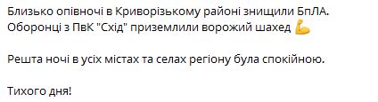 О двух сбитых "Шахедах" (в Криворожском и Днепровском районах) сообщил также глава Днепропетровской области Лысак.