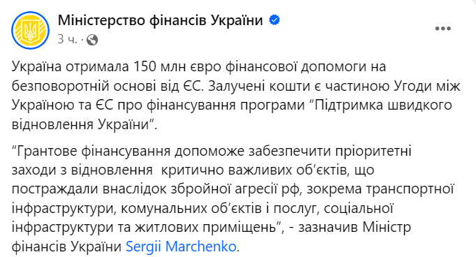 Европейский союз отправил Украине 150 миллионов евро на восстановление. Это грант на безвозвратной основе, который обещают направить на восстановление критически важных объектов.