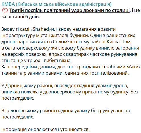 Отмечается, что это уже третья подряд атака дронов по столице за последние шесть дней.