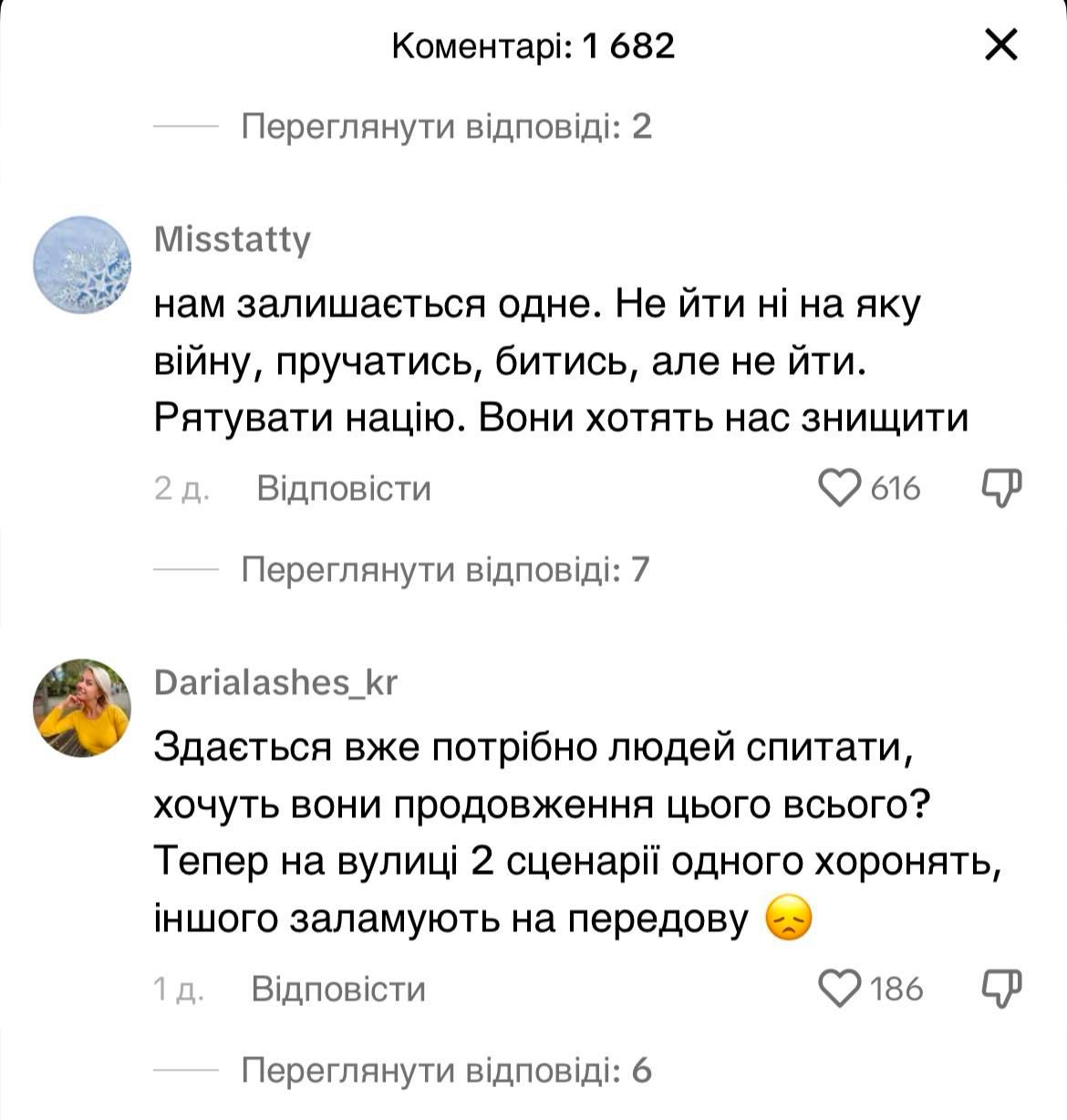 "Так мы хуже. Россия не закрывала границы, а у нас как раз рабство и на войну загоняют палками", "Нам останется одно. Не идти на войну, сопротивляться, биться, но не идти. Спасать нацию. Они хотят нас уничтожить", "Загоняют тюрьмой. Или повестка и война, или сядешь", "Мы ничем не лучше России. Нас насильно ТЦК гребет", "После таких законов действительно выглядит так, что нас нужно спасать", - пишут люди.