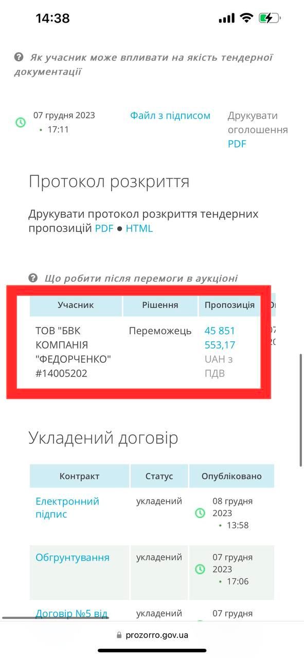 Стоимость работ, указанная в системе Prozorro, составляет 45 851 553,17 гривен. С упомянутой компанией 7 декабря 2023 года уже заключен договор. Срок окончания работ – 25 декабря.