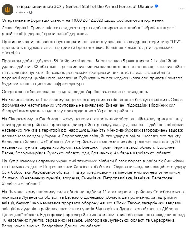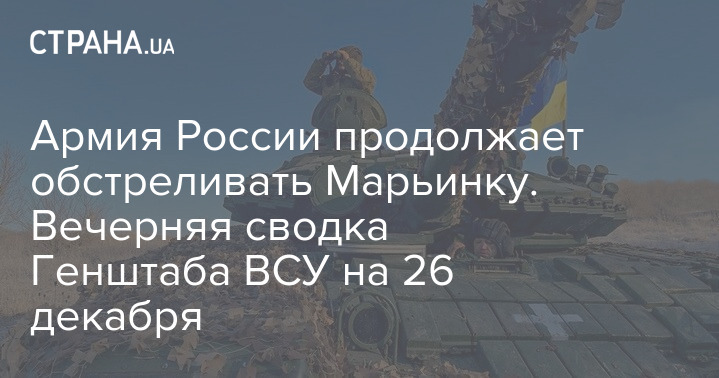 Генштаб ВСУ опубликовал оперативную информацию по состоянию на 18.00 26.12.2023 по российскому вторжению. В ней сообщается, что армия РФ продолжает обстреливать Марьинку из артиллерии и минометов.