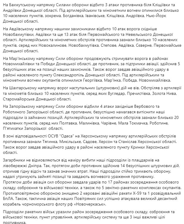 В течение суток произошло 59 боевых столкновений. Враг нанес 5 ракетных и 21 авиационный удар, совершил 38 обстрелов из реактивных систем залпового огня по позициям наших войск и населенных пунктов.