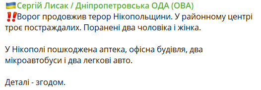 "Враг продолжил террор Никопольщины. В районном центре трое пострадавших. Ранены два мужчины и женщина", - написал он.