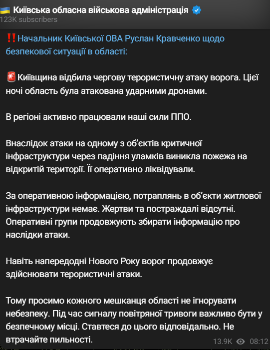 В ГСЧС сообщили, что ночью 31 декабря РФ нанесла четыре удара беспилотниками по центральной части города Харькова.