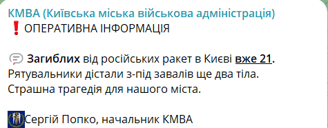 12:20 Погибших от российских ракет в Киеве уже 21 человек. Спасатели извлекли из-под завалов еще два тела, сообщает КГВА.