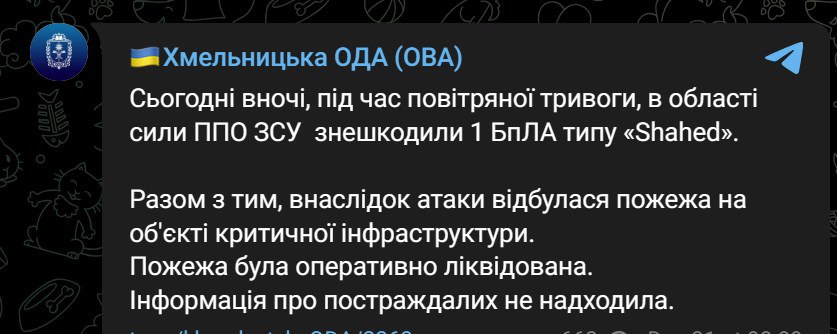 09:41 Ночью "Шахед" попал по объекту критической инфраструктуры в Хмельницкой области.