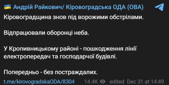 "Кировоградщина снова под вражескими обстрелами. Отработали защитники неба", - написал он.