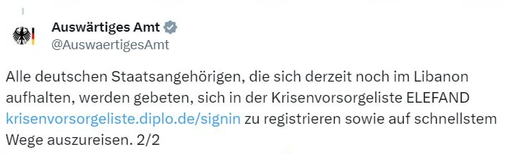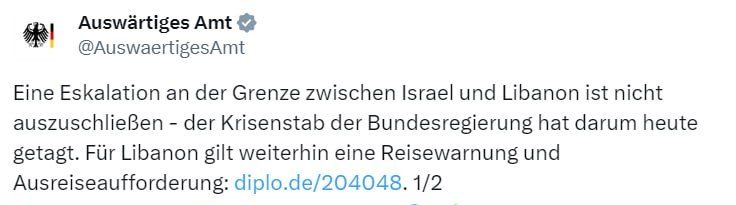 "Нельзя исключать эскалации на границе Израиля с Ливаном. <...> Предупреждение о поездках в Ливан остается в силе", - сообщает МИД Германии, приводя ссылку для регистрации запросов на выезд из Ливана.