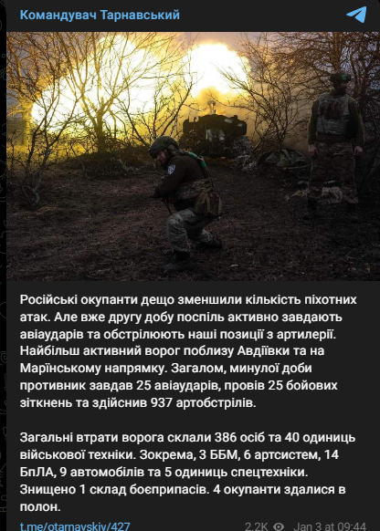 Армия РФ "несколько уменьшила" количество пехотных атак, но уже вторые сутки активно наносит авиаудары и обстреливает позиции ВСУ из артиллерии.