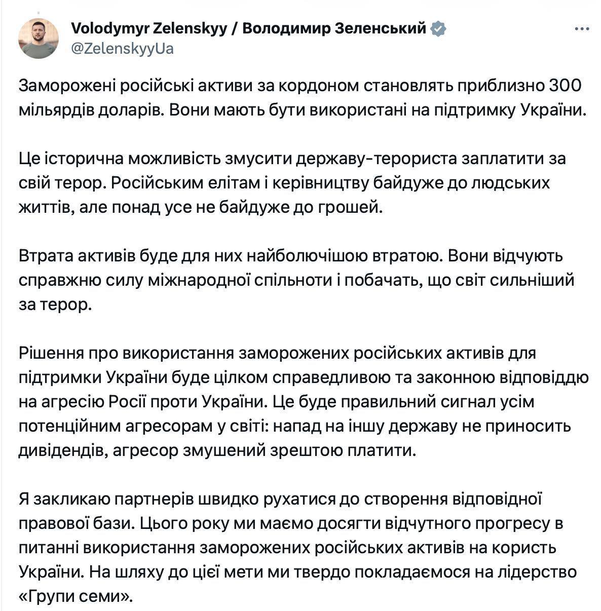 "Российские элиты и руководства безразличны к человеческим жизням, но больше всего не безразличны к деньгам. Потеря активов будет для них самой болезненной потерей. Они ощутят истинную силу международного сообщества и увидят, что мир сильнее террора. Решение об использовании замороженных российских активов для поддержки Украины будет вполне справедливым и законным ответом на агрессию России против Украины. Это будет правильный сигнал всем потенциальным агрессорам в мире: нападение на другое государство не приносит дивидендов, агрессор вынужден в конце концов платить", - сказано в посте.
