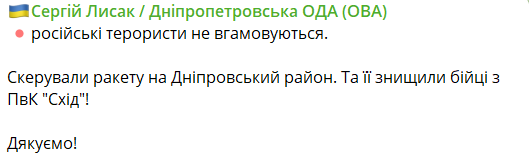 "Российские террористы не унимаются. Направили ракету в Днепровский район. Но ее уничтожили бойцы из ПВК "Восток"", - написал он.