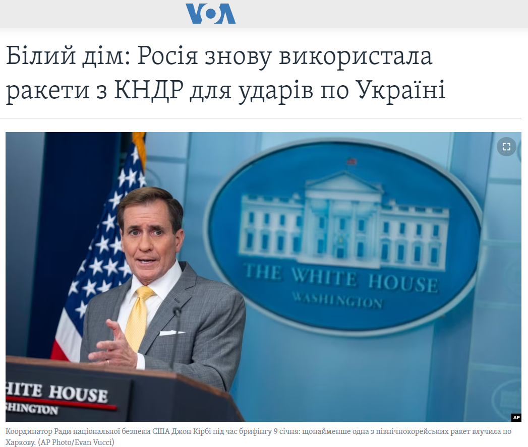 "6 января российские войска снова запустили несколько северокорейских баллистических ракет по Украине. Мы до сих пор оцениваем последствия этих ударов, но можем подтвердить, что по меньшей мере одна из них попала по Харькову", – сказал Кирби.