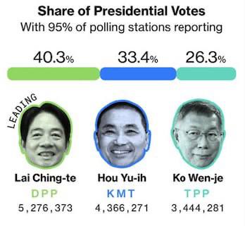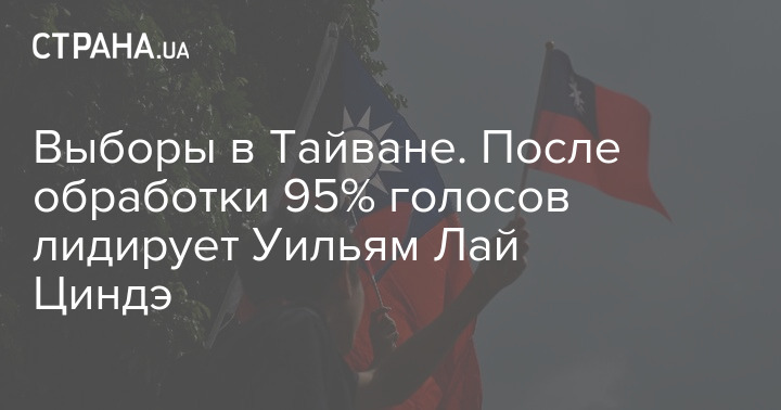 На президентских выборах в Тайване после обработки 95% голосов лидирует Уильям Лай Циндэ, председатель правящей Демократической прогрессивной партии. Он набирает более 40% голосов.