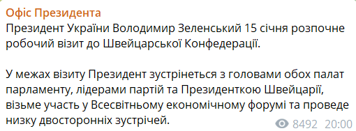 Между тем пресс-служба Офиса президента (ОП) сообщает о том, что Владимир Зеленский 15 января начнет рабочий визит в Швейцарскую конфедерацию.