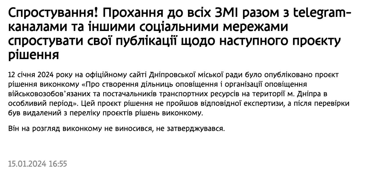 Между тем горсовет Днепра заявил, что проект решения о создании в городе групп розыска военнообязанных не прошел экспертизы и не был принят.