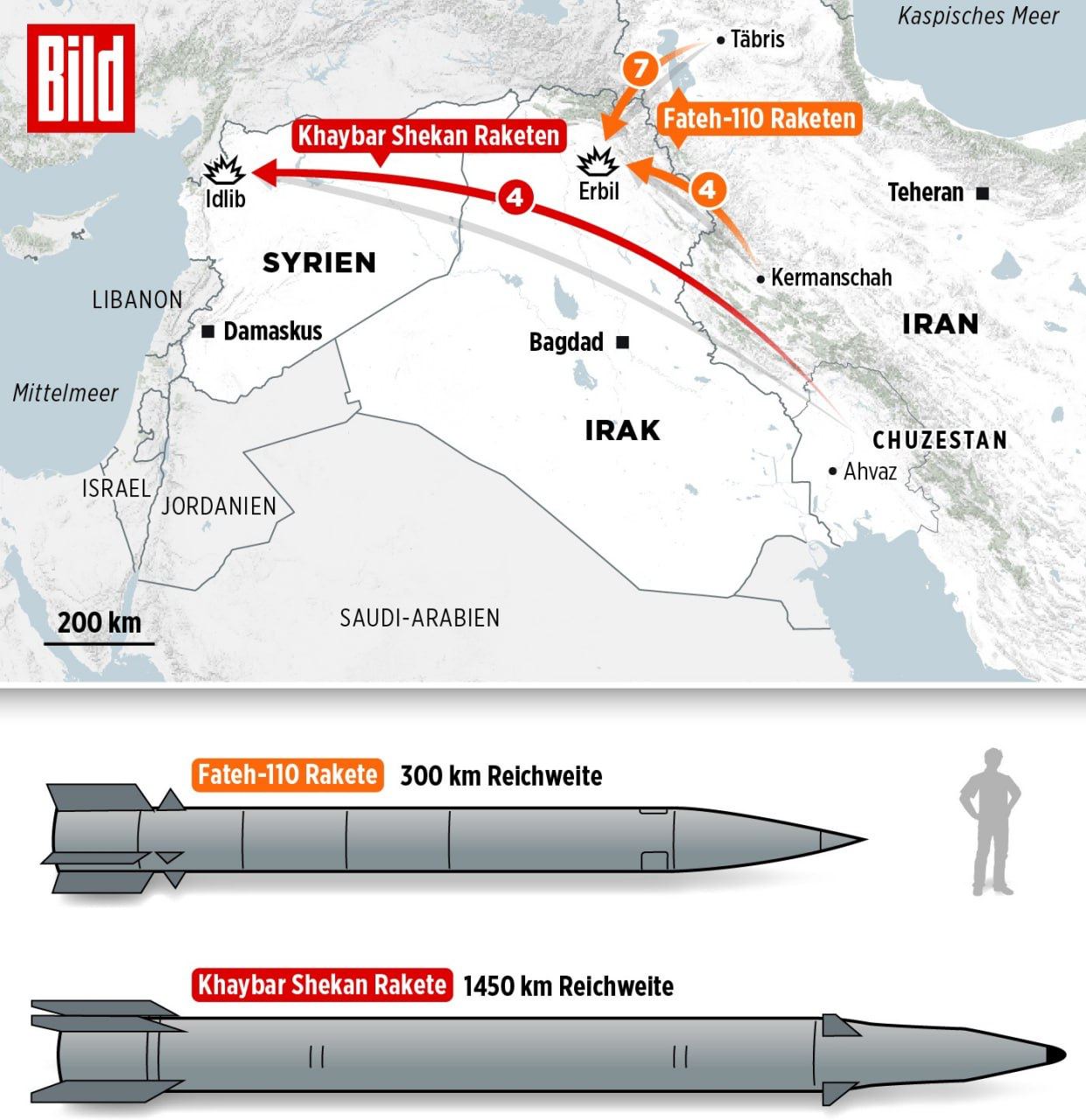 Также КСИР ударил ракетами и беспилотниками по авиабазе и консульству США в Ираке. Иран заявил, что нанес удары по "шпионской базе" в иракском Эрбиле, запустив баллистические ракеты класса "земля-земля" типа "Фатх 110". Также в Эрбиле был нанесен удар по авиабазе США и консульству США.