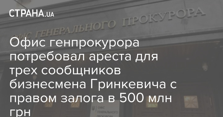 Офис генерального прокурора Украины требует для трех сообщников львовского бизнесмена Игоря Гринкевича меру пресечения в виде ареста с возможностью внесения залога по 500 миллионов гривен каждому.
