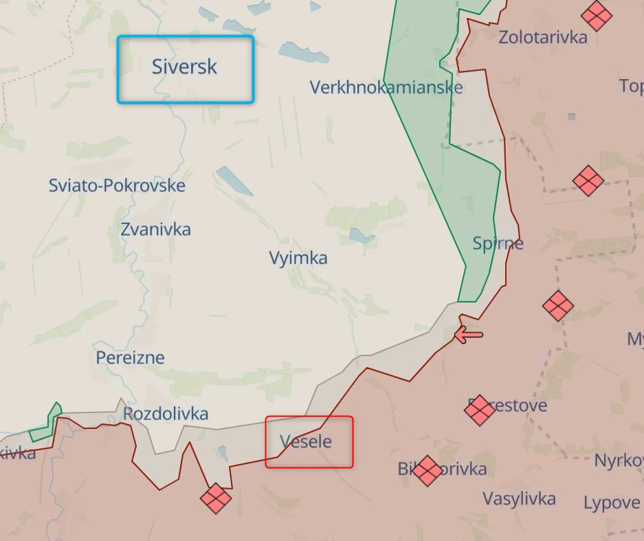 Российские войска "практически захватили Веселое" под Северском, подтвердил сегодня украинский военный паблик Deep State. На его обновленной карте деревня большей частью под российским контролем, а северные окраины - в "серой" зоне.