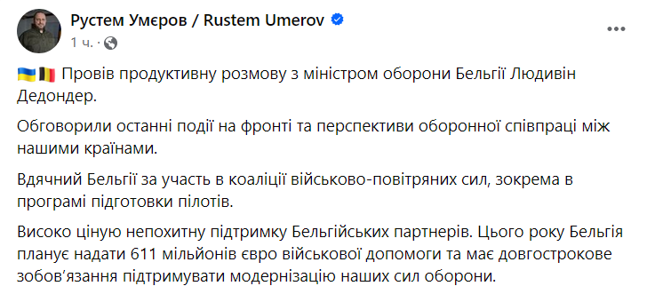 "Провел продуктивный разговор с министром обороны Бельгии Людивин Дедондер. Обсудили последние события на фронте и перспективы оборонного сотрудничества между нашими странами. Высоко ценю непреклонную поддержку бельгийских партнеров. В этом году Бельгия планирует предоставить 611 миллионов евро военной помощи и имеет долгосрочное обязательство поддерживать модернизацию наших Сил обороны", - говорится в сообщении.
