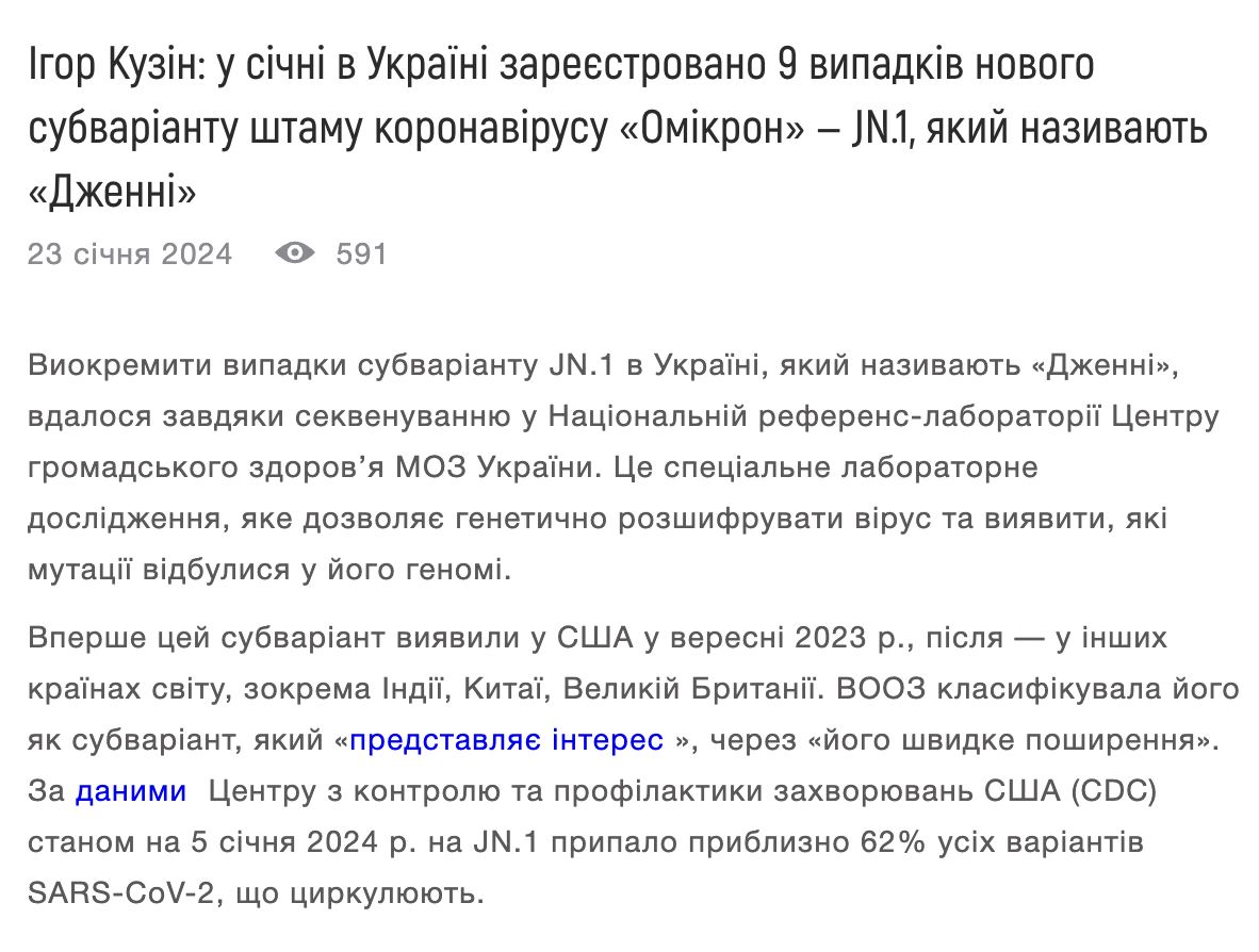 В Украине в январе зарегистрировано 9 случаев заражения новым видом коронавируса "Дженни".
