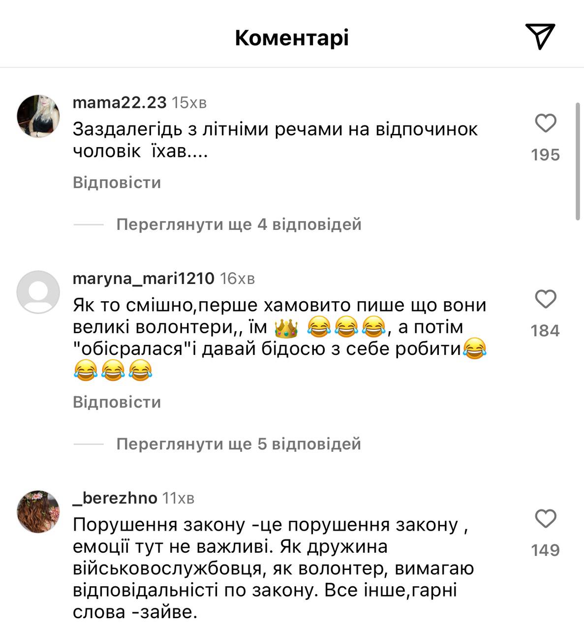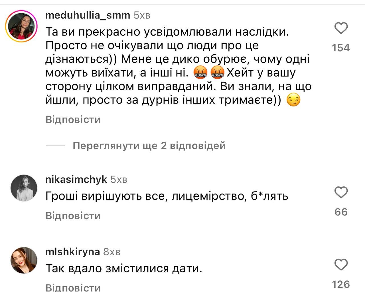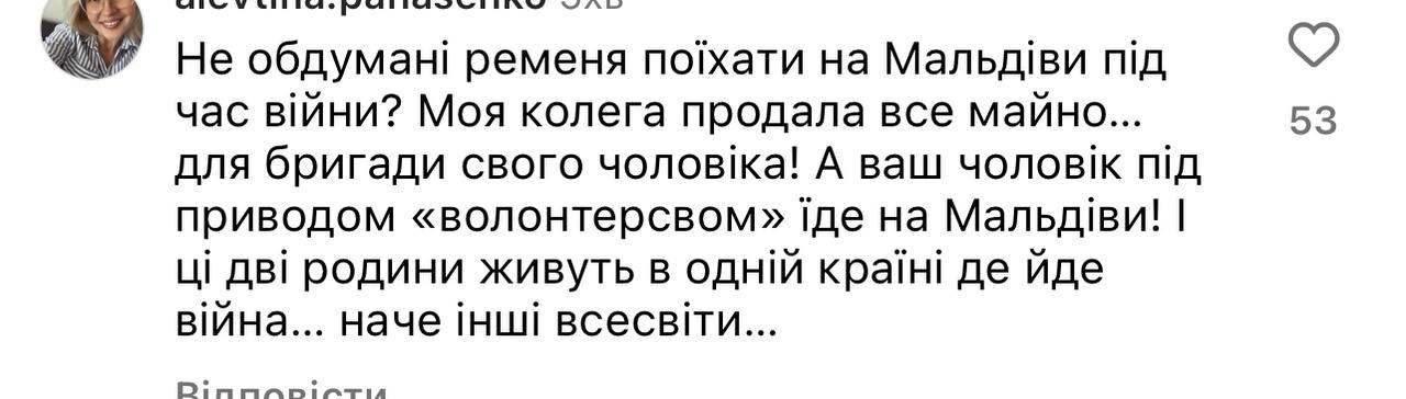 "Необдуманное решение поехать на Мальдивы во время войны? Моя коллега продала все имущество для бригады мужа. А ваш мужчина под предлогом волонтерства едет на Мальдивы"; "Заранее с летними вещами на отдых мужчина ехал"; "Но вы прекрасно понимали последствия. Просто не ожидали, что люди об этом узнают. Меня это дико возмущает, почему одни могут уехать, а другие нет. Хейт в вашу сторону вполне оправдан. Вы знали, на что шли, просто за дураков других держите", - возмутились пользователи соцсети.