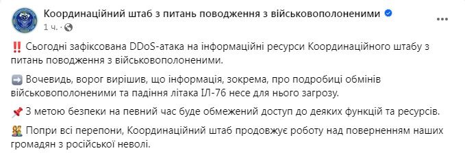 "Сегодня зафиксирована DDoS-атака на информационные ресурсы Координационного штаба по обращению с военнопленными. Очевидно, враг решил, что информация, в частности, о подробностях обменов военнопленными и падении самолета ИЛ-76 несет для него угрозу", - предположили в штабе.