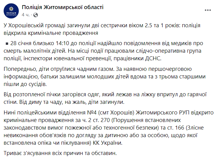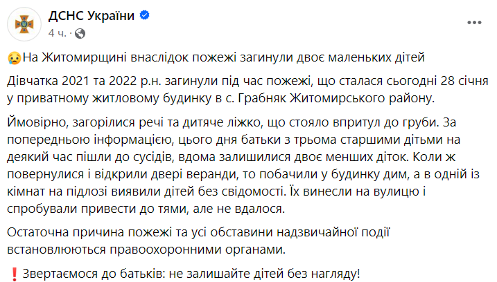 В воскресенье, 28 января, в Житомирской области в результате пожара в частном доме погибли девочки 2021 и 2022 годов рождения.