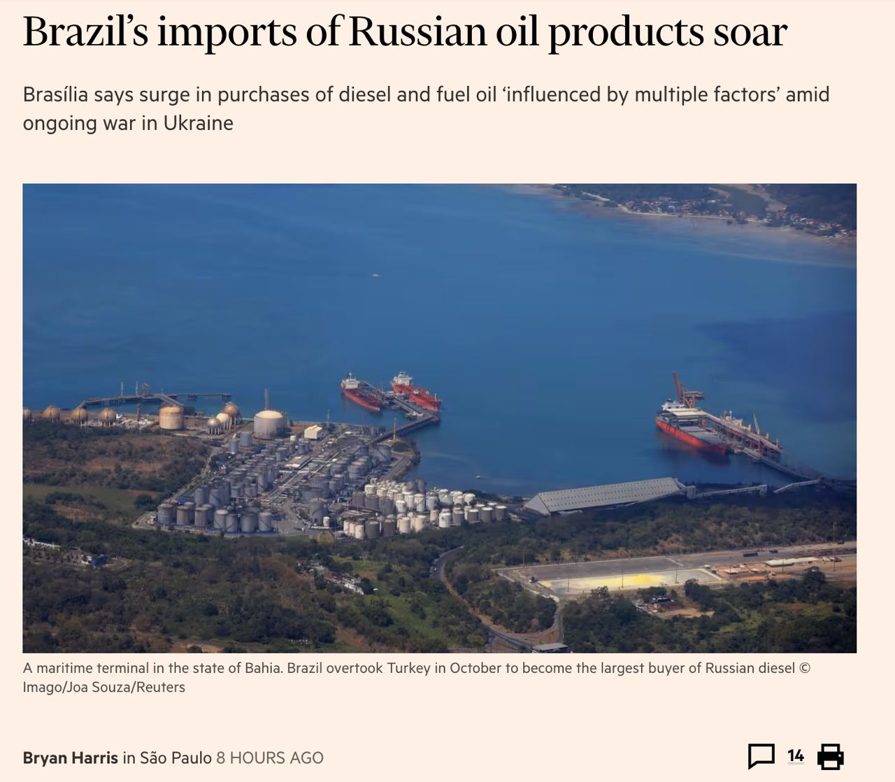 Бразилия в прошлом году стала крупнейшим покупателем российского дизельного топлива. РФ обогнала США как крупнейшего поставщика в Бразилию. Ее доля выросла с 50% до 85%.