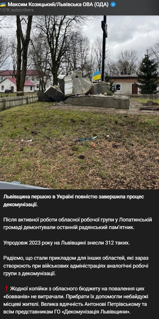 За 2023 год в регионе снесли 312 советских памятников. Последний демонтировали в Лопатинской громаде.