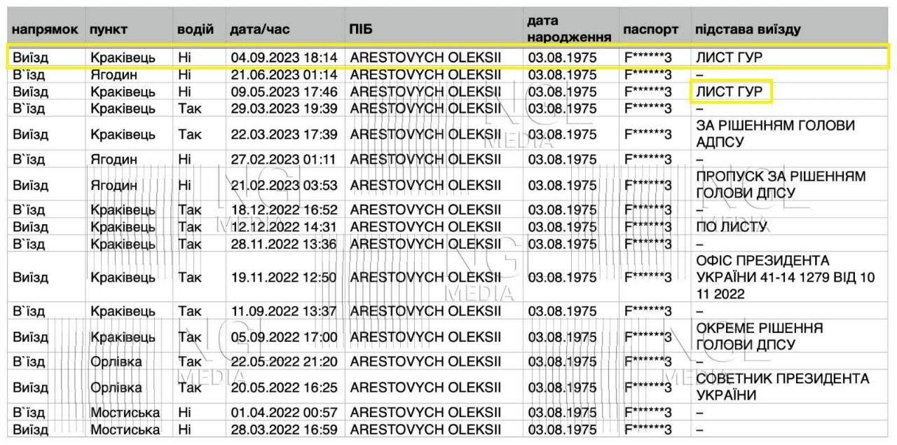 Из данных пограничной базы, которые публикует NGL media, следует, что Арестович, по крайней мере дважды, использовал письма ГУР как основание для выезда.