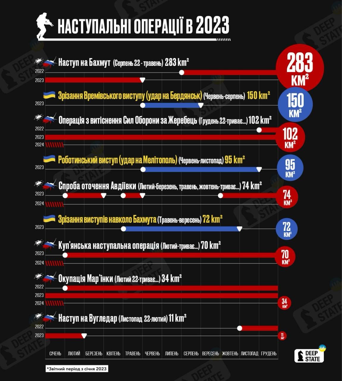 Военный паблик Deep State сегодня подвел итоги наступательных операций за 2023 год. По его данным, армия РФ за этот период заняла 574 кв. км территорий Украины, а ВСУ - 317 кв. км.