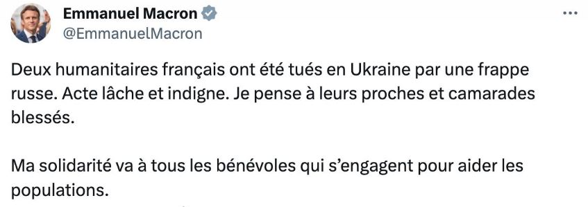 "Два французских гуманитарных работника были убиты в Украине в результате российского удара. Трусливый и возмутительный поступок. Я выражаю солидарность всем волонтерам, которые стремятся помочь людям", - написал президент Франции в Х.