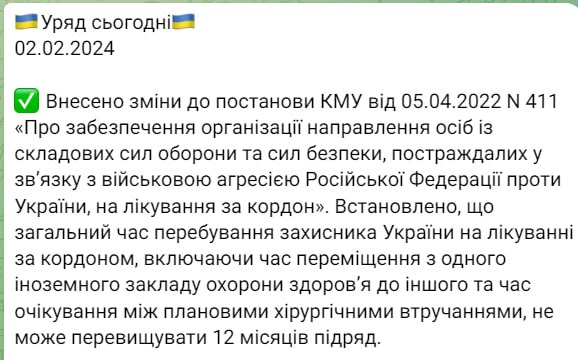 "Внесены изменения в постановление КМУ от 05.04.2022 N 411... Установлено, что общее время пребывания защитника Украины на лечении за границей, включая время перемещения из одного иностранного учреждения здравоохранения в другое и время ожидания между плановыми хирургическими вмешательствами, не может превышать 12 месяцев подряд", - говорится в сообщении.