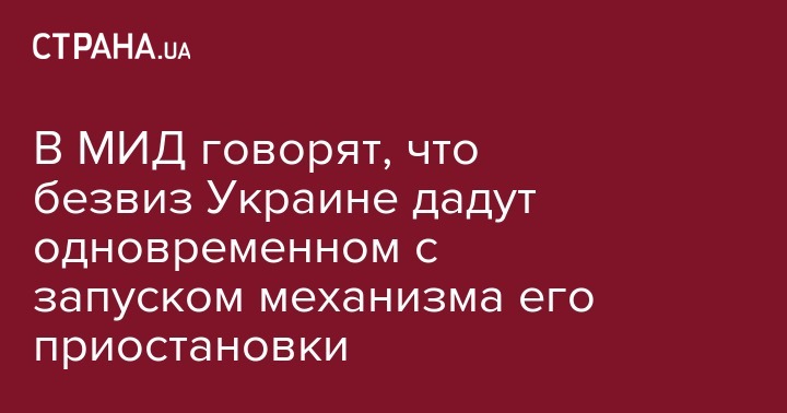 В Министерстве иностранных дел Украины говорят, что вопрос предоставления Евросоюзом безвизового режима для украинцев деполитизирован, и его предоставят одновременном с вступлением в силу механизма приостановки действия безвизового режима. Об этом спикер МИД Украины Марьяна Беца сказала в комментарии агентству "Интерфакс-Украина".