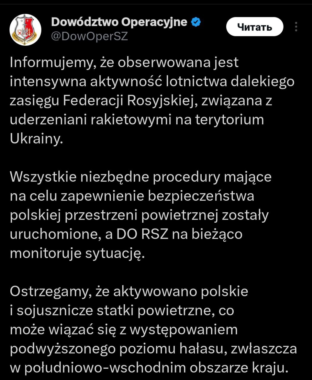 07.38 Польша подняла самолёты во время ракетной атаки РФ по Украине, заявляет польское командование.