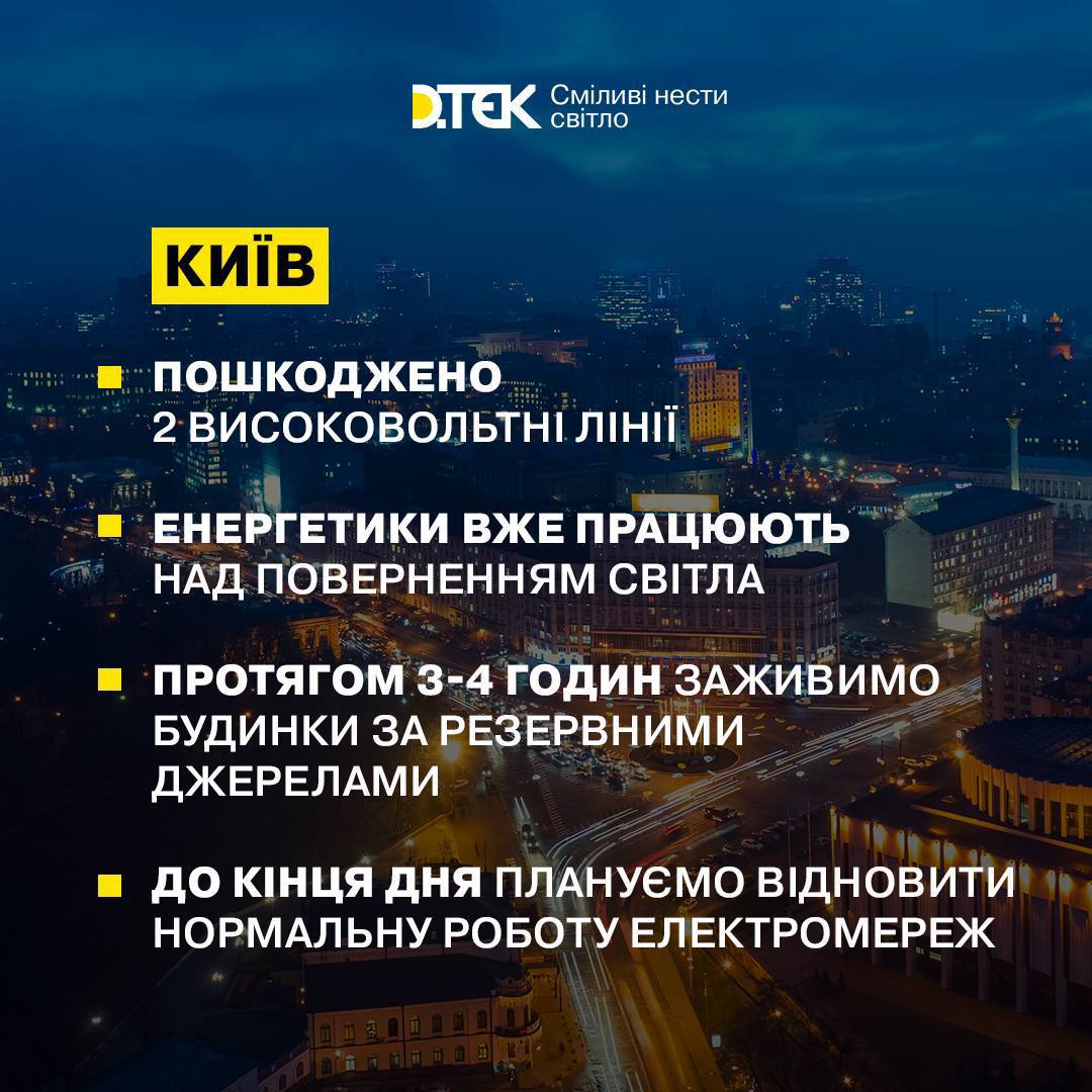 09.19 ДТЭК обещает вернуть свет в киевские дома через 3-4 часа.