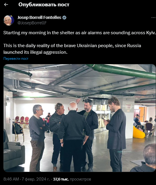 Глава дипломатии Евросоюза Боррель начал утро в Киеве с похода в укрытие. Фото: Х
