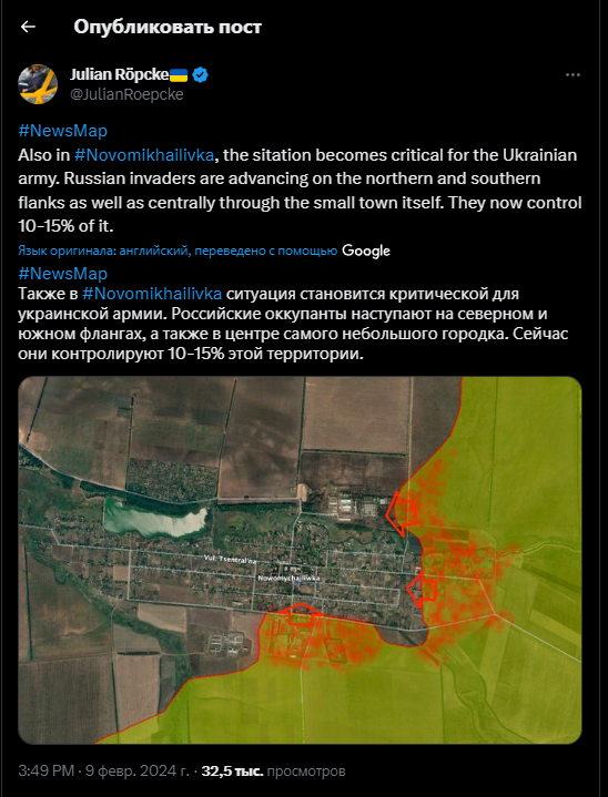 Украинский военный эксперт Константин Машовец считает, что, вероятно, ВСУ уже не контролируют восточную окраину Новомихайловки. "Бои, надо понимать, уже идут в самом селе", - пишет он.