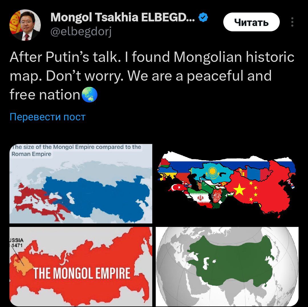 Так, бывший президент Монголии Цахиагийн Элбэгдорж опубликовал карту Монгольской империи 13 века, в состав которой входила значительная часть нынешних территорий Китая и России, вся Средняя Азия и Иран.